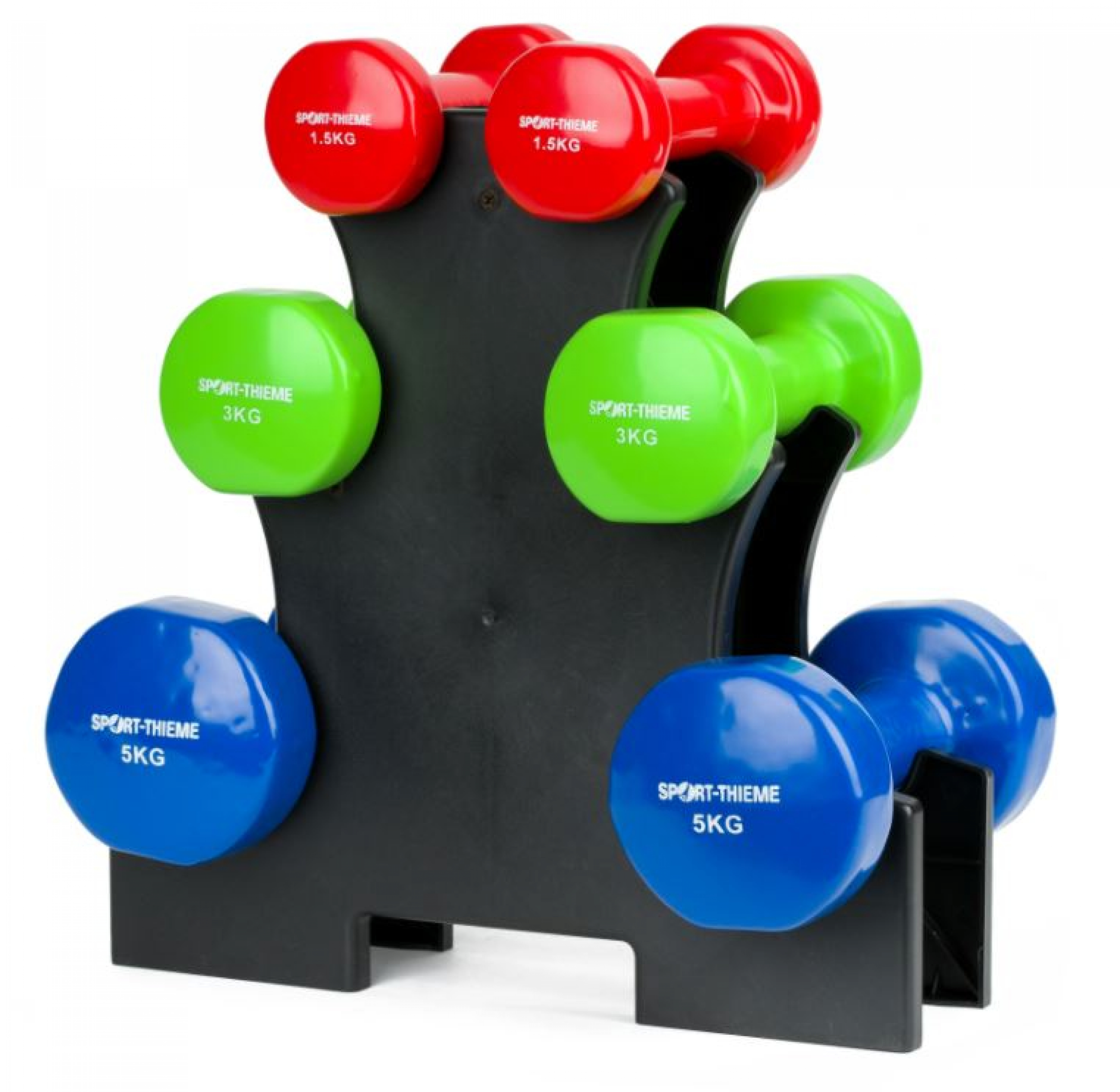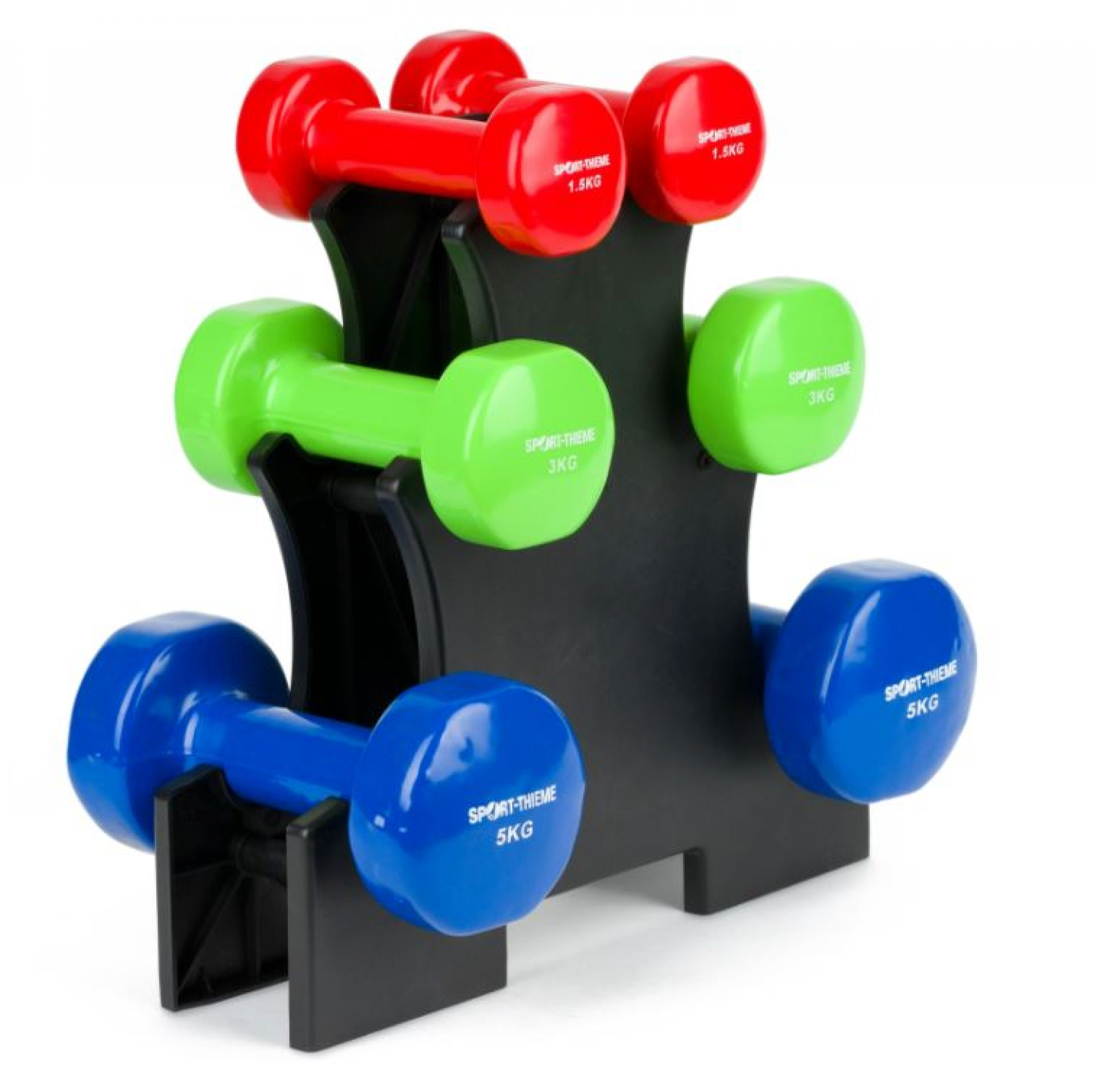 Das Vinyl-Hantel Set besteht aus 6 Kurzhanteln in 3 unterschiedlichen Gewichten. Ob im Fitnessstudio, im Verein oder Zuhause: Das Set eignet sich perfekt für Übungen in der Fitness oder im Krafttraining. Im Hantel-Set enthalten ist ein Ablageständer. Auf diesem lassen sich 3 Hantel-Paare platzsparend nach dem Training aufbewahren.